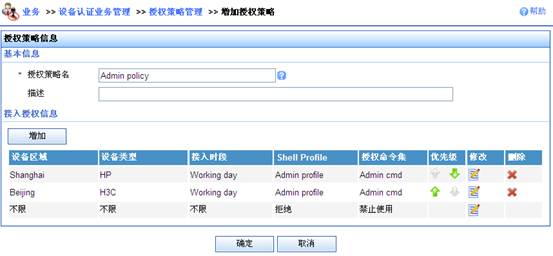 支持按場景分配授權(quán)策略,場景是設(shè)備位置區(qū)域、設(shè)備類型和接入時(shí)段的組合,可定義在不同場景下設(shè)備管理用戶所使用的Shell Profile和操作命令集。