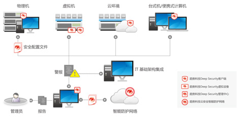 趨勢科技Deep Security客戶端:該小型軟件組件部署在受保護(hù)的服務(wù)器或虛擬機(jī)上,用于實施數(shù)據(jù)中心的安全策略(防惡意軟件、Web信譽、入侵阻止、防火墻、完整性監(jiān)控和日志檢查)。